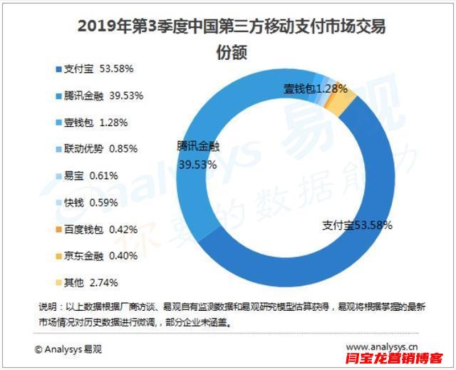 2019 年 Q3,支付寶、財富通(含微信支付)占據了中國移動支付市場的 93.11%,分列一、二名;2020 年 Q3,支付寶與財付通依舊穩居一二,緊隨其后的是壹錢包等移動支付代表,而 PayPal 并未在列。